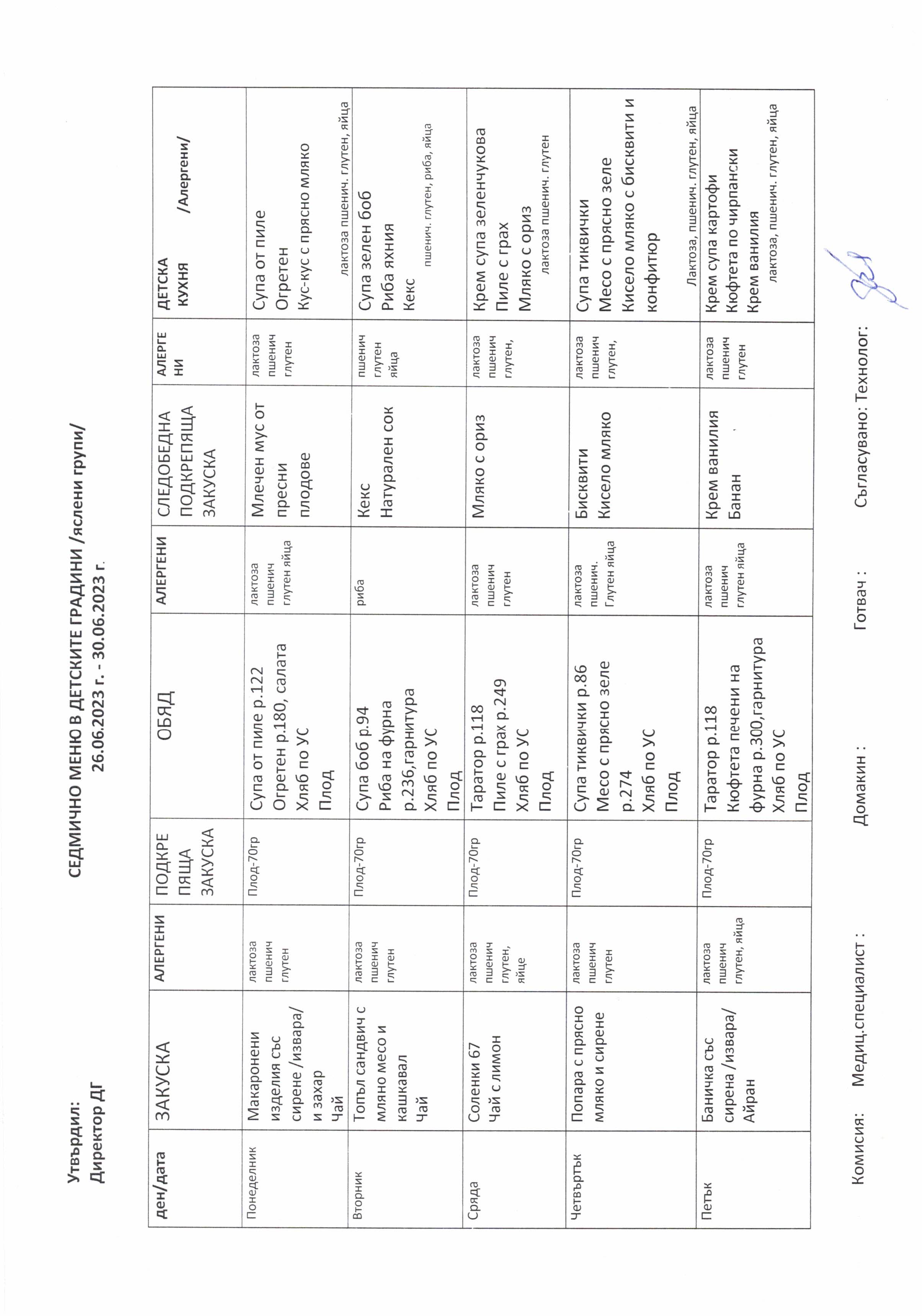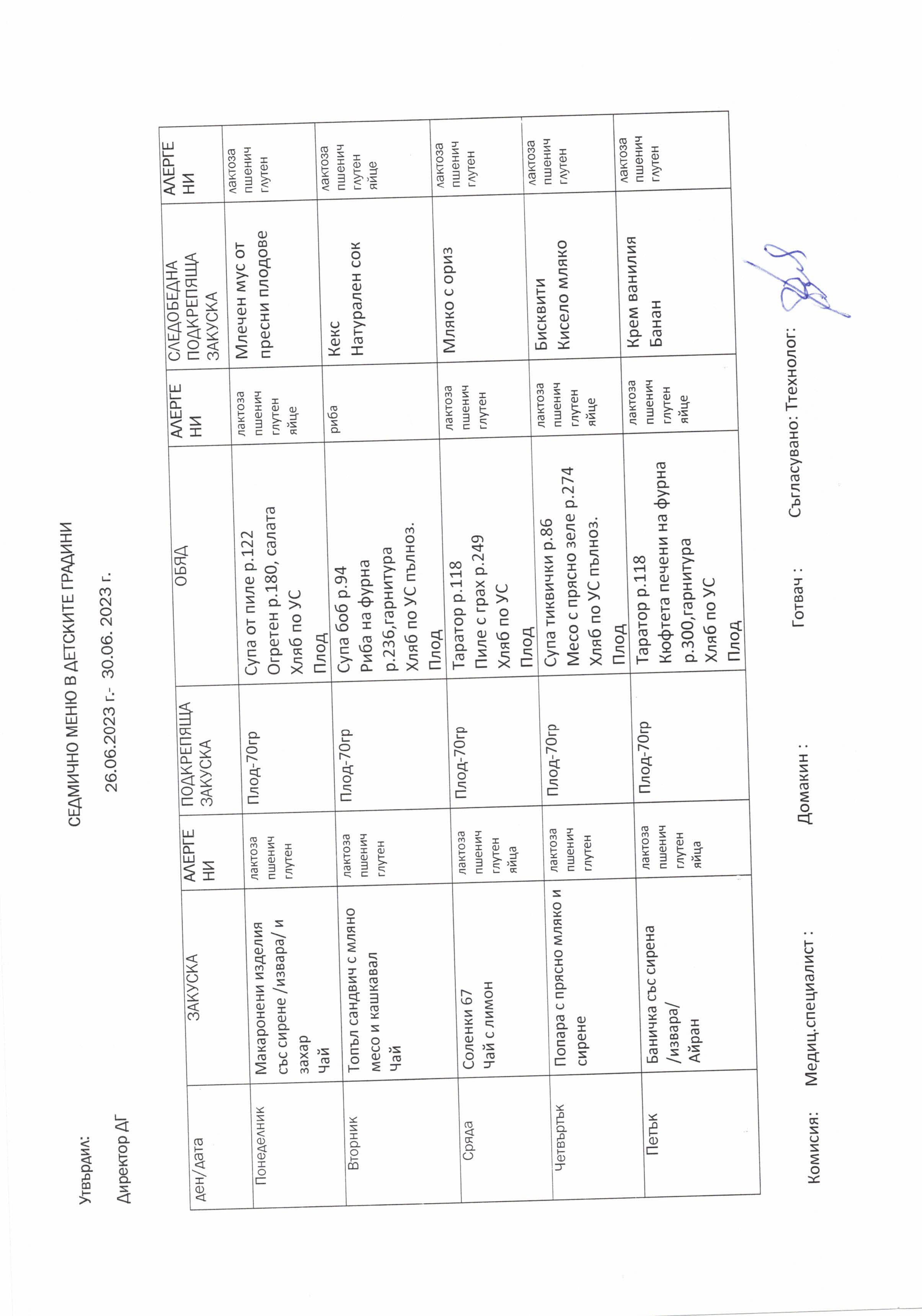 Седмично меню детска градина 26-06-30-06-2023 г.