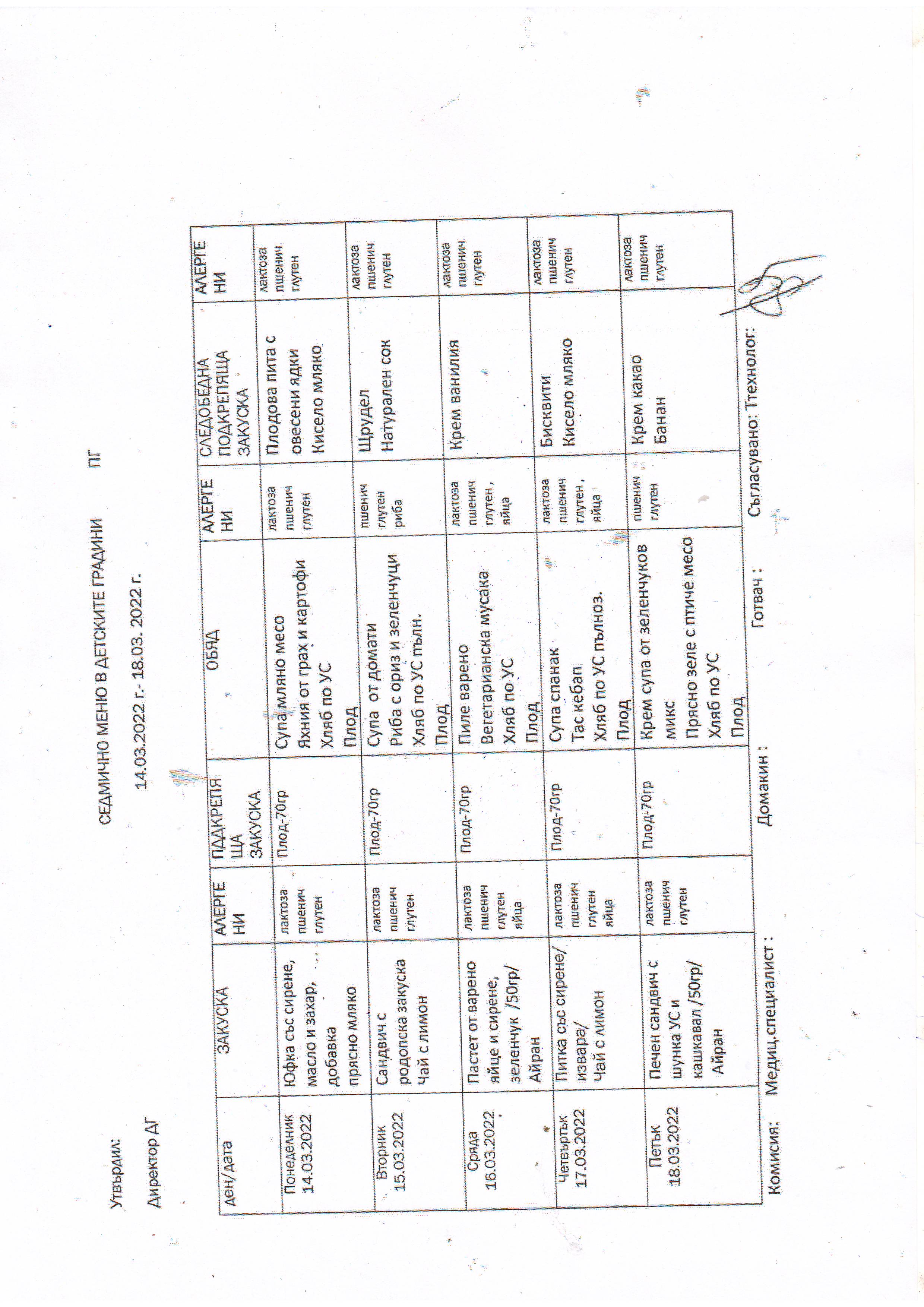 Седмично меню детска градина 07-03-11-03-2022 г.