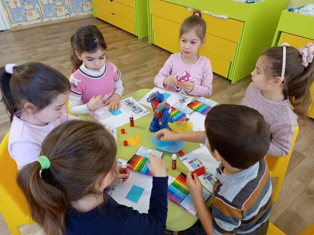 Децата знаят, че роботът е наш приятел - изпълнява команди и прави "чудеса". Ето защо в началото на месец февруари 2022 година децата от група "Светулка" направиха роботи от геометрични фигури - квадратчета, правоъгъкничета, триъгълничета.Нарекоха го Оптимус.